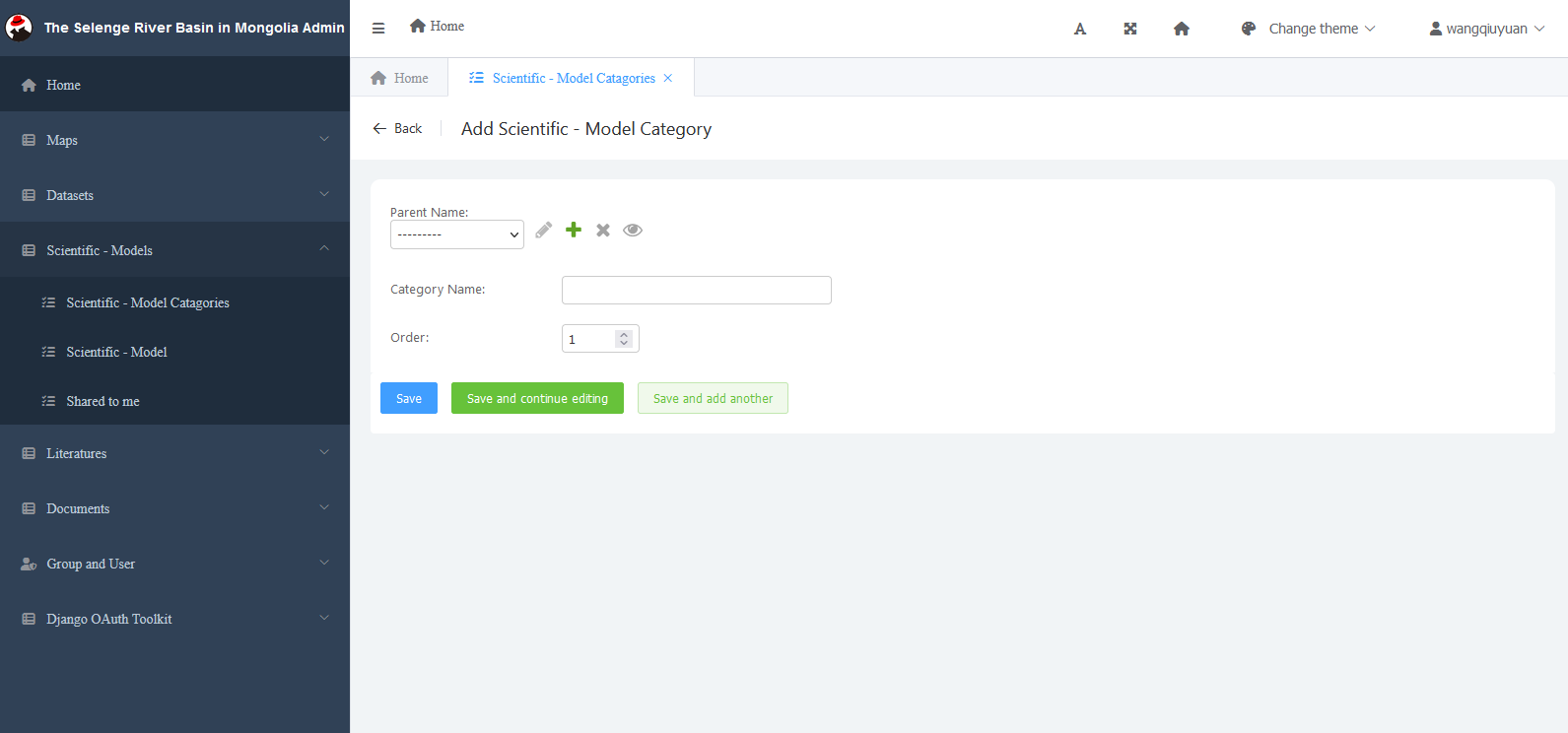 Сэлэнгэ мөрний сав газрын шинжлэх ухааны тооцооллын загварын менежмент нь: нэмэх, устгах, импортлох, экспортлох, хайх, сэргээх функцүүд, баримт бичигт баримт бичгийн гарчиг, файлын ID, контейнер зургийн ID, үүсгэх хугацаа, шинэчлэх хугацаа, нэмэх, устгах үйлдлүүдийг багтаана. Баримт бичгийг нэмэх функц нь :numref:`Загвар тооцооллын ангилалд үзүүлсэн шиг файлын дүрсийг сонгон авч болно. `.